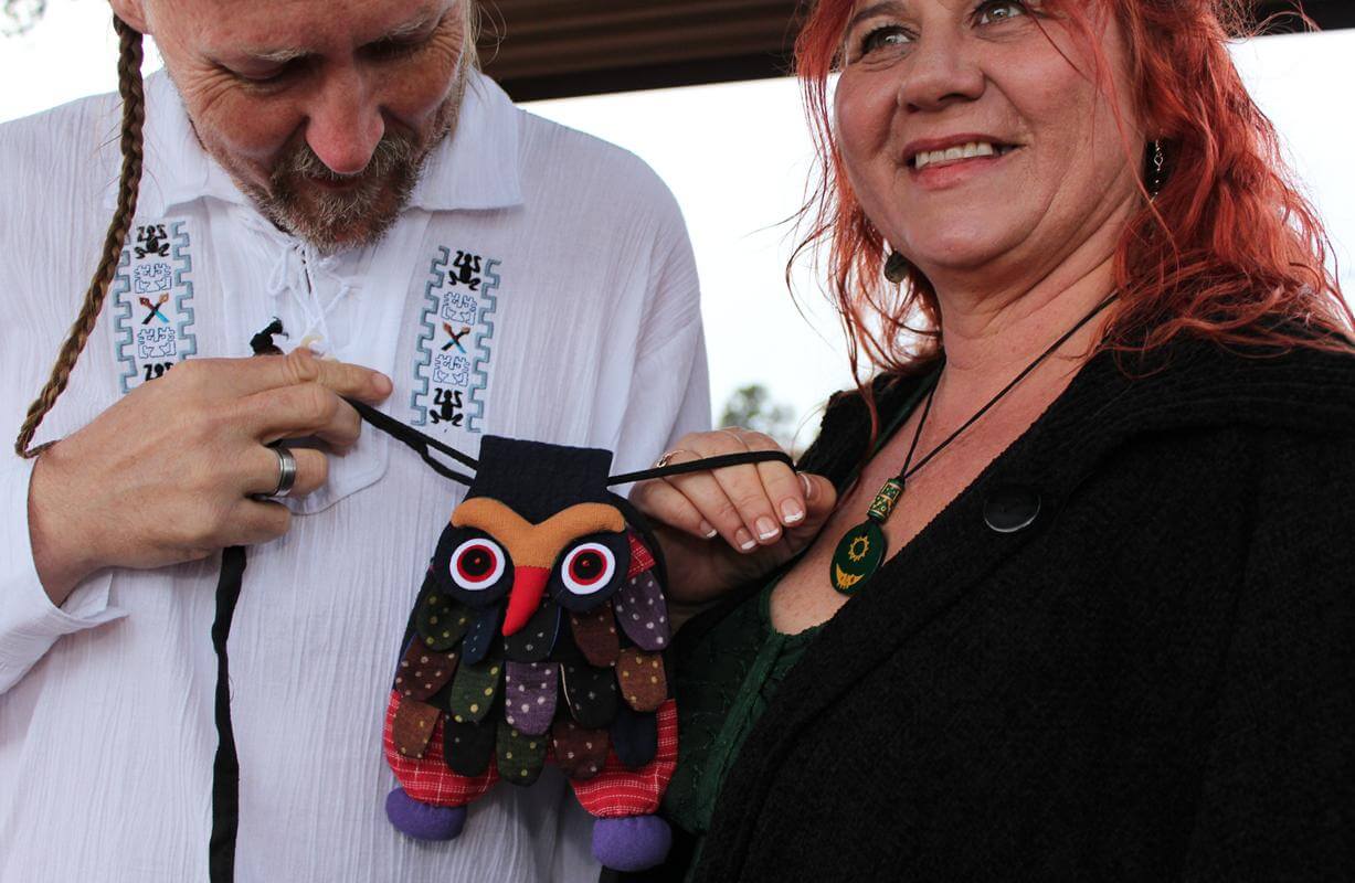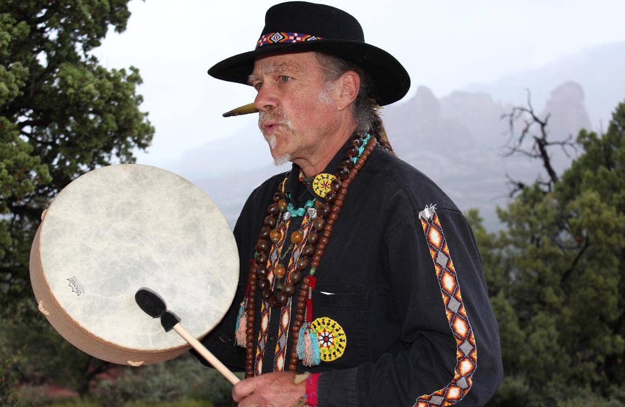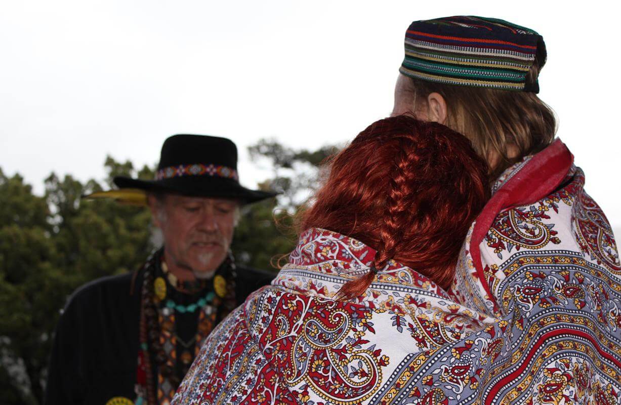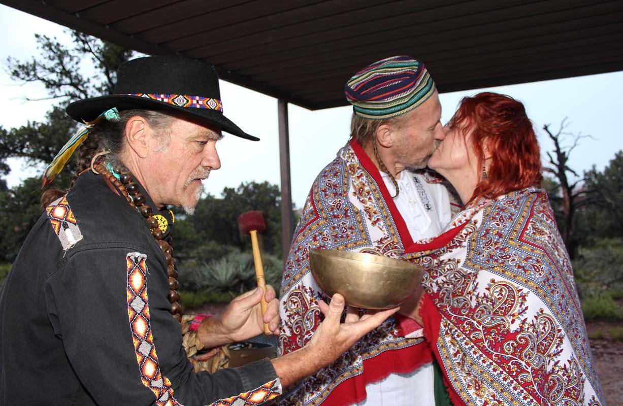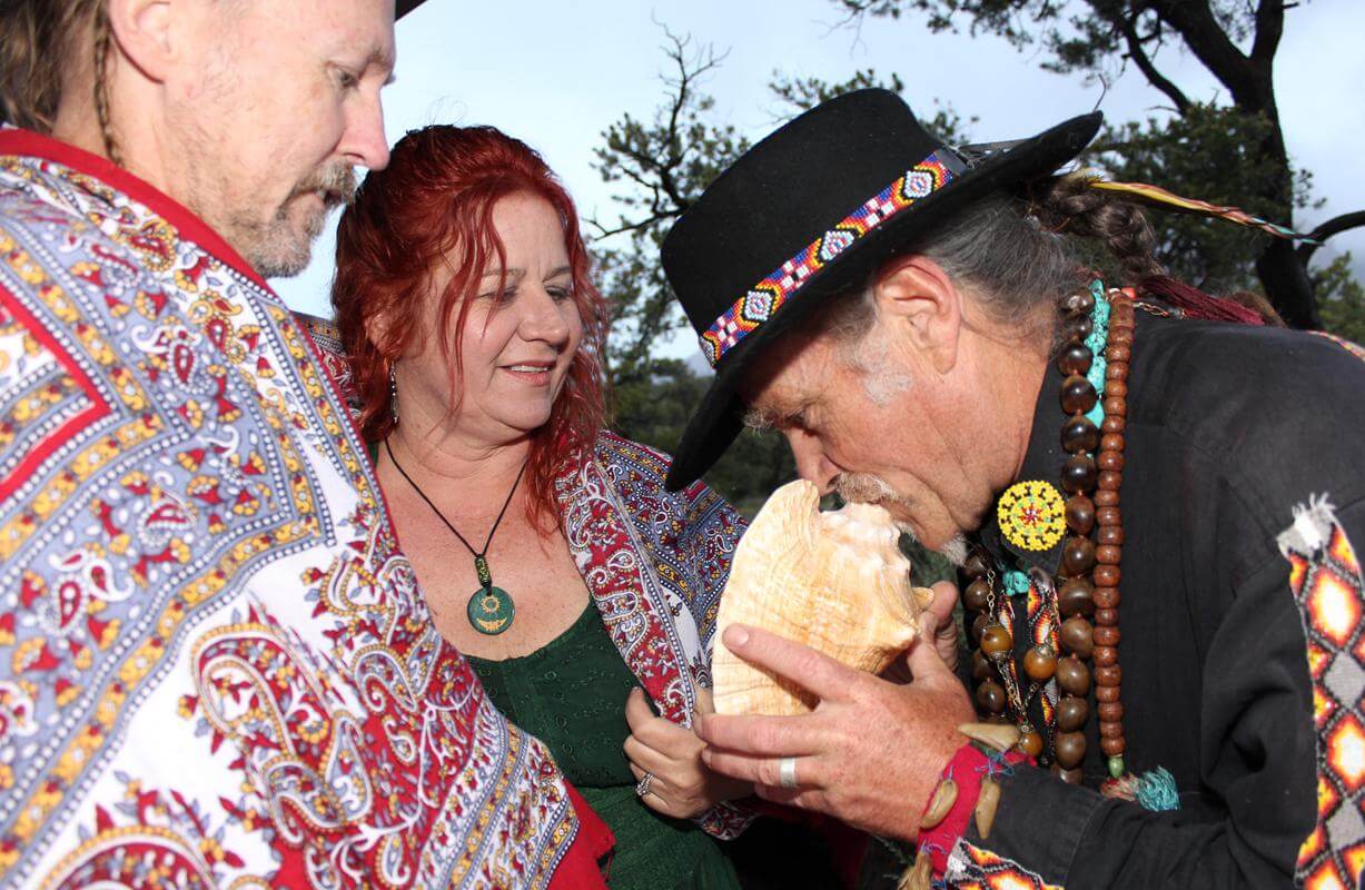 with Smudging, Calling in the Directions, Creating Sacred Space, Drumming, Flute and Sacred Song, Heart Activating Conch Song and Marriage Pouch Tradition - A flute and drum serenade by your officiant